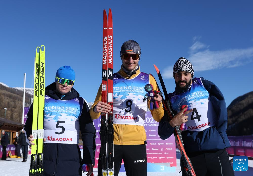 Gold medalist Marco Maier (C) of Germany, silver medalist Denis Zinov (L) of Kazakhstan and bronze medalist Garik Melkonyan of Armenia pose for photos after the awarding ceremony for LW class of the Men's 10km Free final of para cross country event at the Torino 2025 FISU World University Winter Games in Pragelato, Italy, Jan. 15, 2025. (Xinhua/Li Jing)