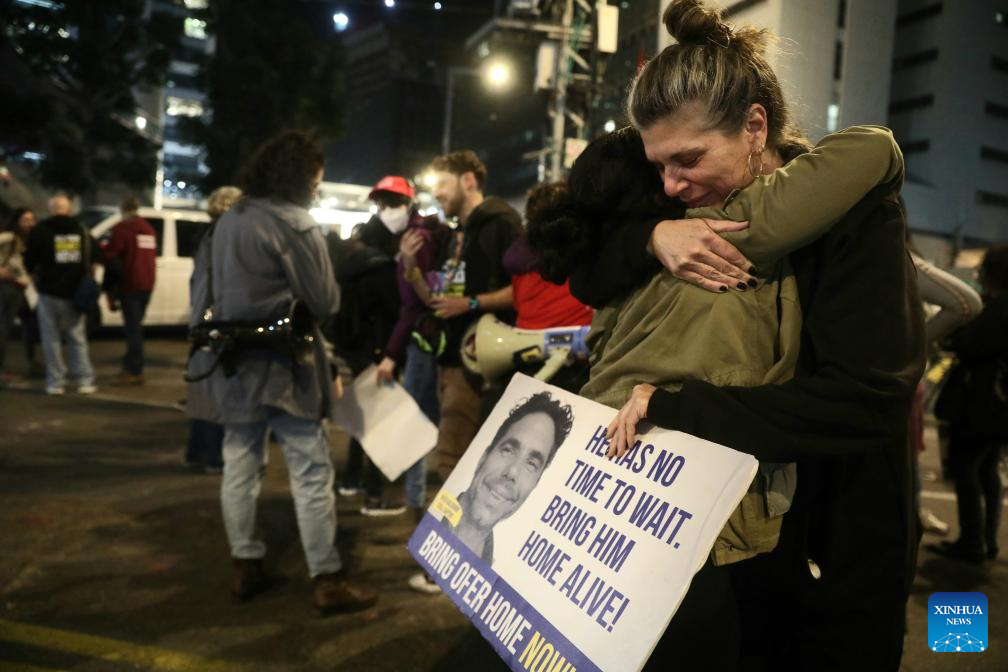 Relatives and supporters of hostages held in the Gaza Strip embrace each other amid reports of a ceasefire deal between Israel and Hamas, in Tel Aviv, Israel, on Jan. 15, 2025. Israel and Hamas have agreed to a Gaza ceasefire-for-hostages deal following intensive mediation by Qatar, Egypt, and the United States, Qatar's prime minister announced on Wednesday. (Gideon Markowicz/JINI via Xinhua)