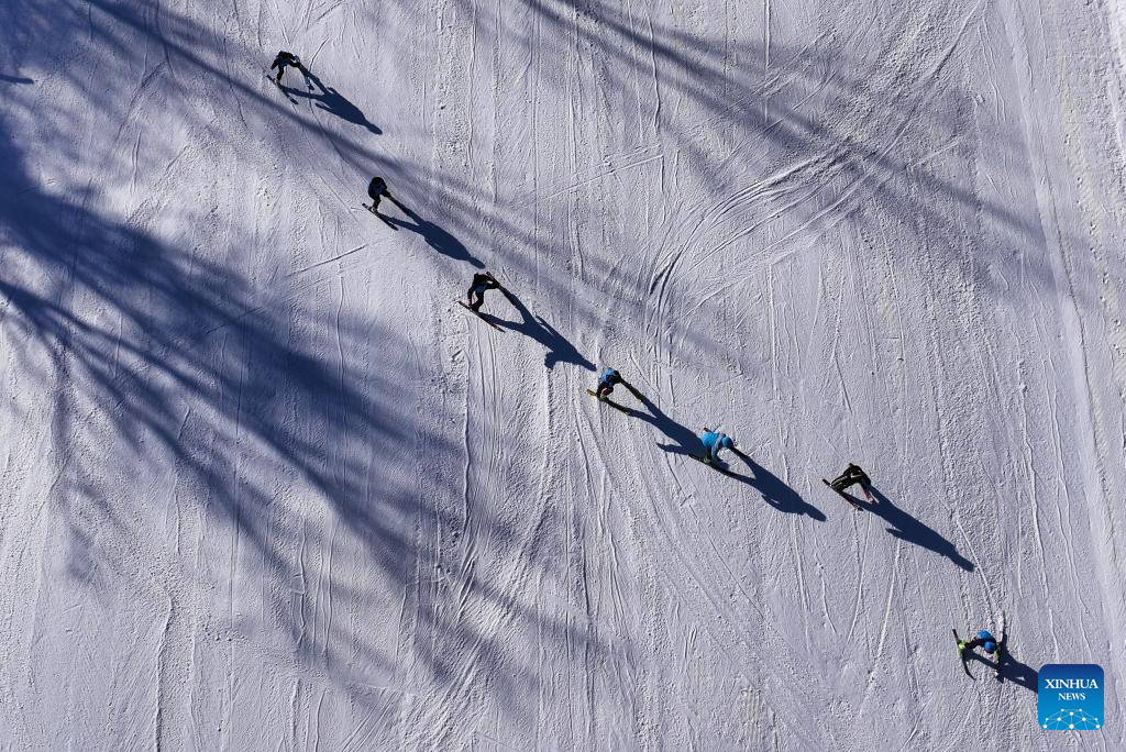 An aerial drone photo taken on Jan. 15, 2025 shows people skiing in Yuexi County, east China's Anhui Province. (Xinhua/Du Yu)