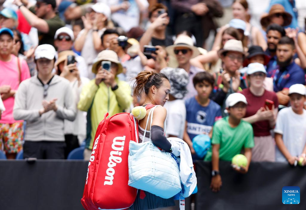 Zheng Qinwen leaves the court after the women's singles 2nd round match between Zheng Qinwen of China and Laura Siegemund of Germany at Australian Open tennis tournament in Melbourne, Australia, Jan. 15, 2025. (Xinhua/Ma Ping)