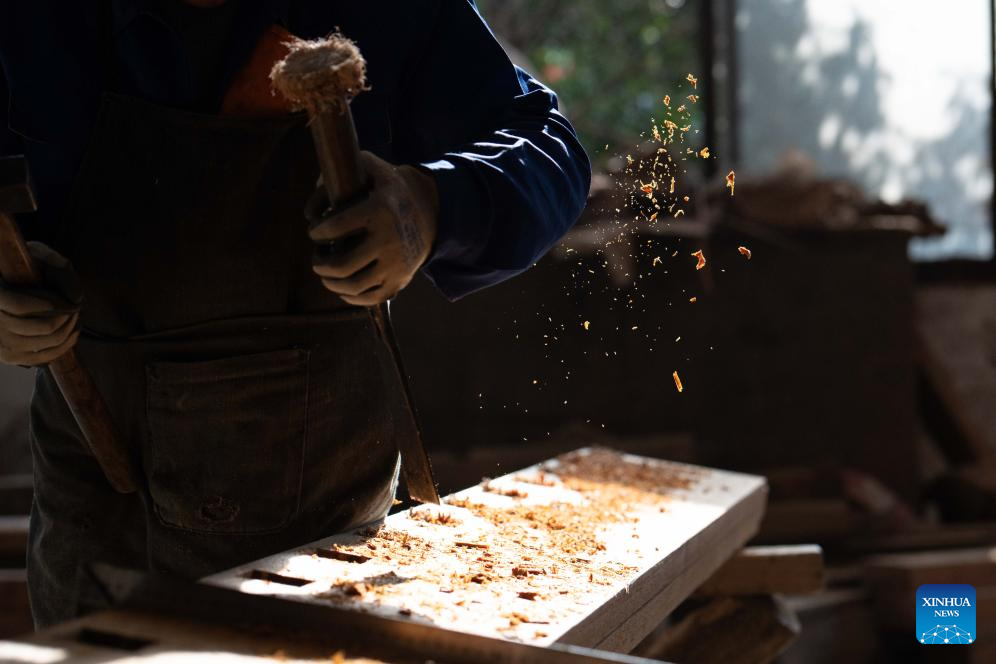 A worker carves a piece of lumber for the construction of Hui-style building in ancient style at a company in Huangshan, east China's Anhui Province, Jan. 6, 2025. (Xinhua/Zhang Duan)