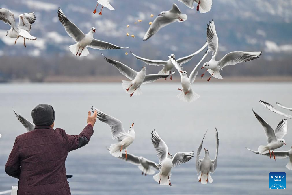 A man feeds birds at Lake Ohrid in Ohrid, North Macedonia, on Jan. 15, 2025. (Photo by Tomislav Georgiev/Xinhua)