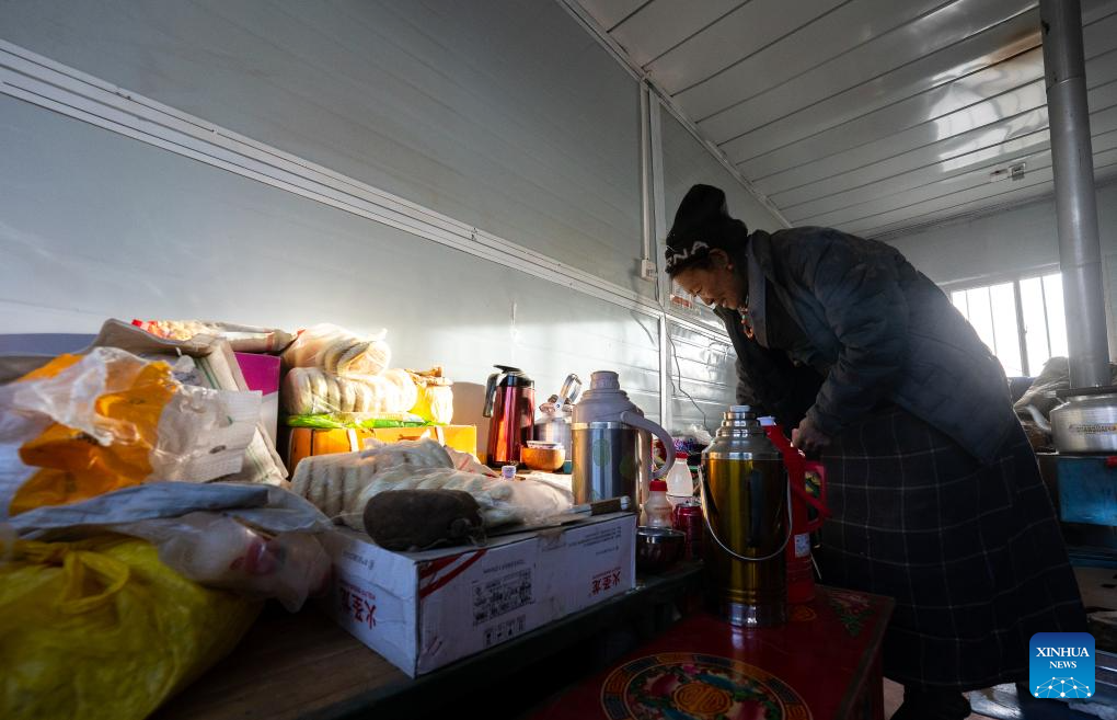 Chefs from a restaurant make meals for residents at a resettlement site in Chamco Township, Dingri County in Xigaze, southwest China's Xizang Autonomous Region, Jan. 15, 2025. The disaster relief work in quake-hit Dingri County including makeshift houses construction, supply transportation and debris removal work have been accelerated to better meet the needs and improve the living conditions of the residents. (Xinhua/Tenzin Nyida)