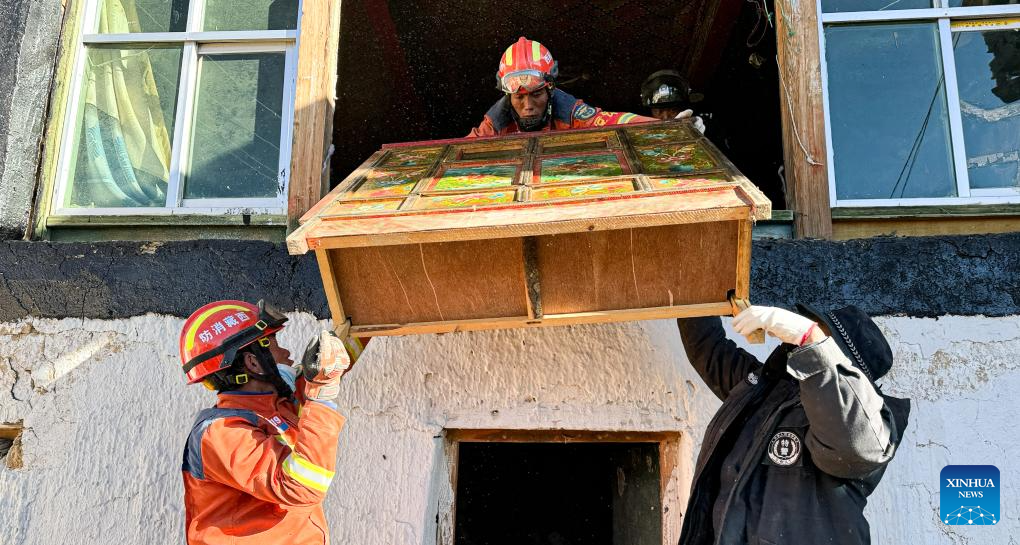 Rescuers help residents move furniture in Qulho Township, Dingri County in Xigaze, southwest China's Xizang Autonomous Region, Jan. 15, 2025. The disaster relief work in quake-hit Dingri County including makeshift houses construction, supply transportation and debris removal work have been accelerated to better meet the needs and improve the living conditions of the residents. (Photo by Benba Toinzhub/Xinhua)