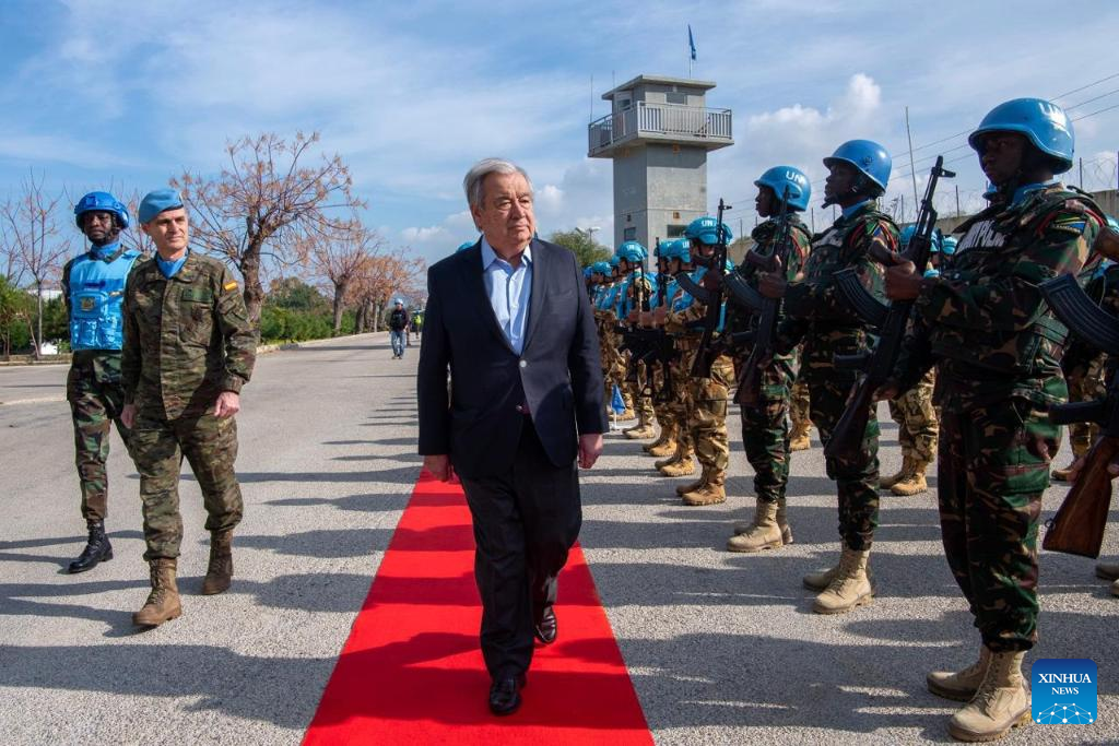 UN Secretary-General Antonio Guterres (C) inspects peacekeepers at the headquarters of the United Nations Interim Force in Lebanon (UNIFIL) in Naqoura, Lebanon, Jan. 18, 2025. UN Secretary-General Antonio Guterres on Friday called for a halt of Israeli military operations in Lebanon. Addressing peacekeepers at the headquarters of the UNIFIL in southern Lebanon, Guterres said, "The continued occupation by the Israel Defense Forces inside the UNIFIL area operations and the conduct of military operations in Lebanese territory are violations of resolution 1701 and pose a continued risk to your safety and security." (Photo by Taher Abu Hamdan/Xinhua)