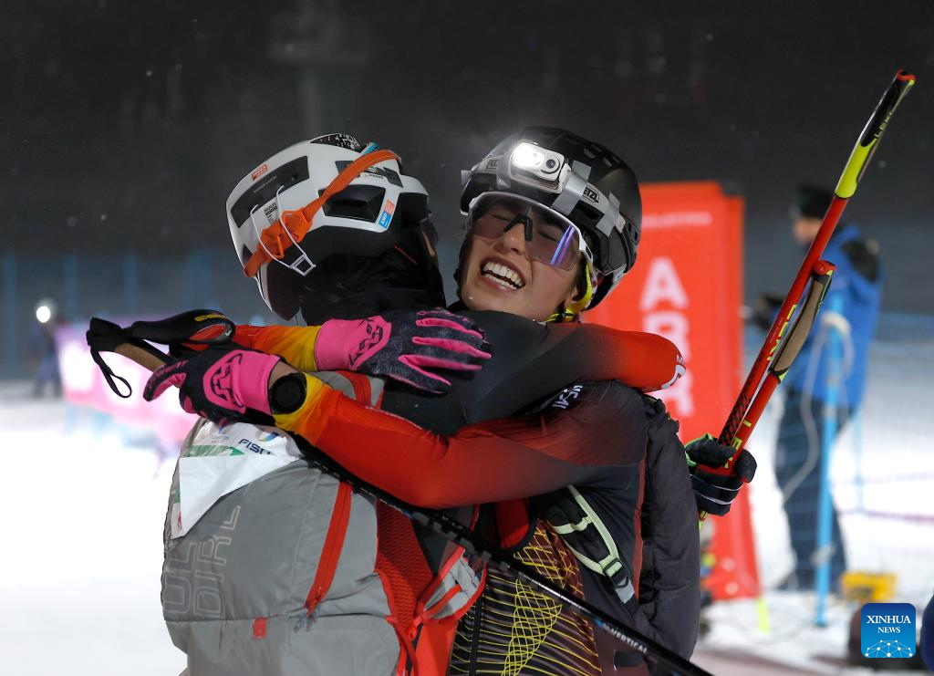 Maria Ordonez Cobacho (L) of Spain and her compatriot Ares Torra celebrate after the Women's Sprint Final of Ski Mountaineering at the 2025 FISU Winter World University Games in Sestriere, Italy, Jan. 16, 2025. (Xinhua/Ding Xu)