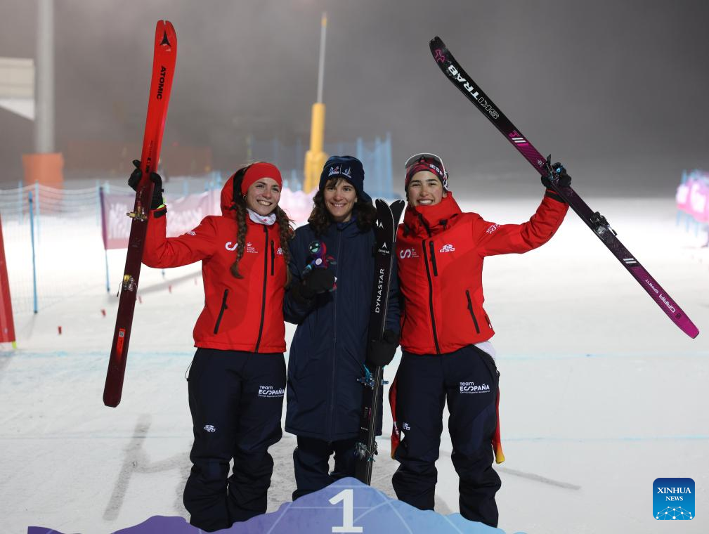 Gold medalist Margot Ravinel (C) of France, silver medalist Maria Ordonez Cobacho (L) of Spain and bronze medalist Ares Torra of Spain celebrate during the mascot ceremony for the Women's Sprint Final of Ski Mountaineering at the 2025 FISU Winter World University Games in Sestriere, Italy, Jan. 16, 2025. (Xinhua/Ding Xu)