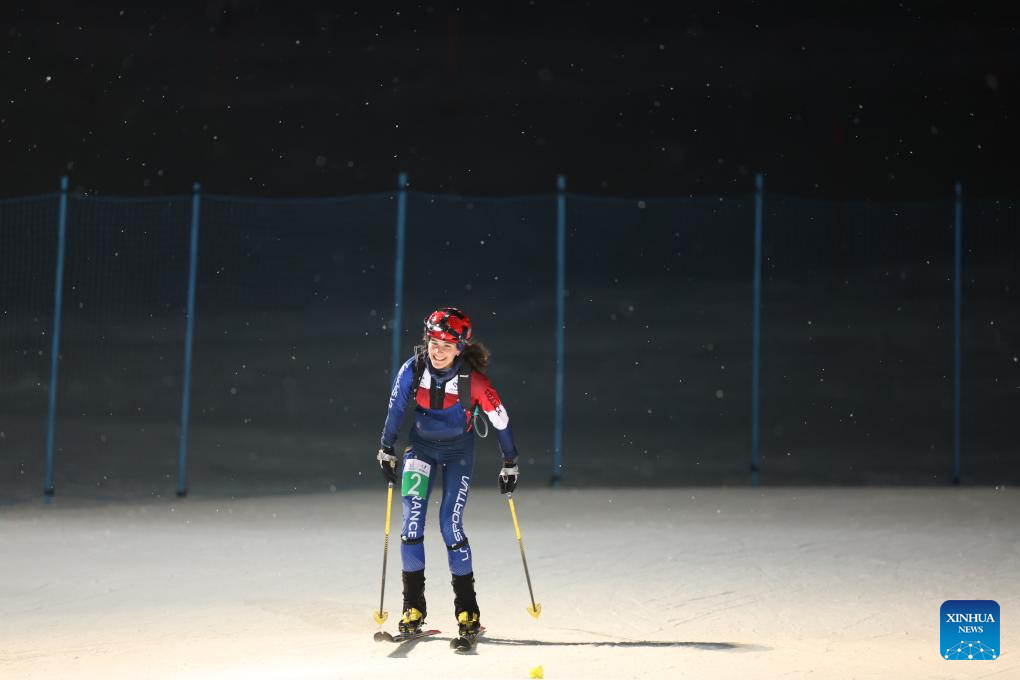 Margot Ravinel of France competes during the Women's Sprint Final of Ski Mountaineering at the 2025 FISU Winter World University Games in Sestriere, Italy, Jan. 16, 2025. (Xinhua/Zhang Chen)