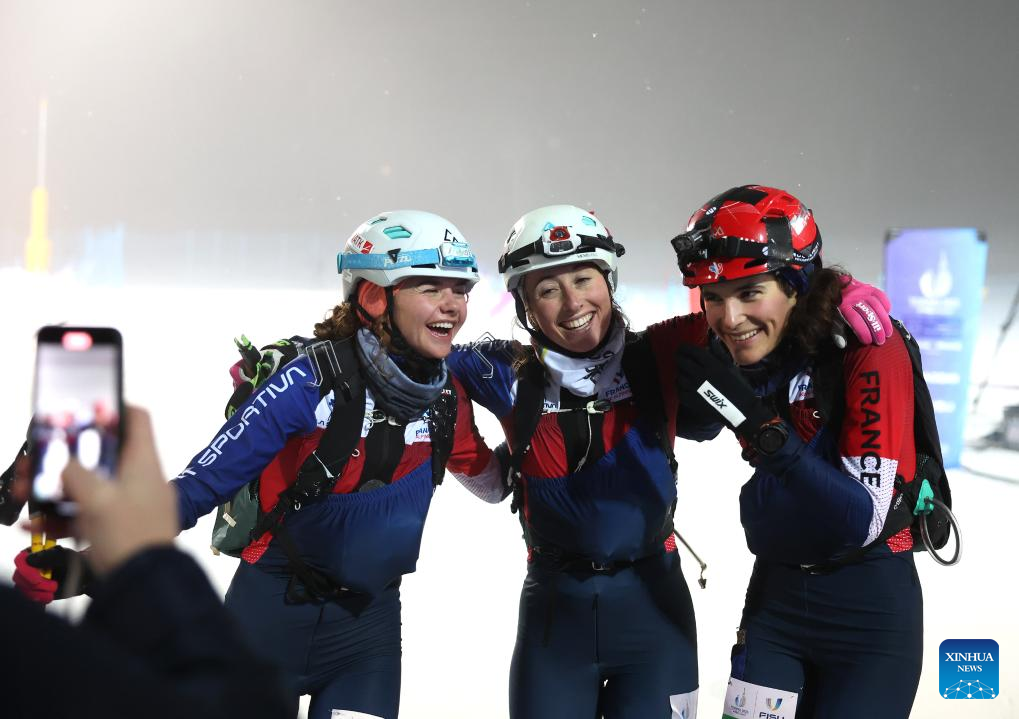 Gold medalist Margot Ravinel (R) of France poses for photos with her compatriot athletes Louna Dupont (C) and Loanne Roussillon after the Women's Sprint Final of Ski Mountaineering at the 2025 FISU Winter World University Games in Sestriere, Italy, Jan. 16, 2025. (Xinhua/Zhang Chen)