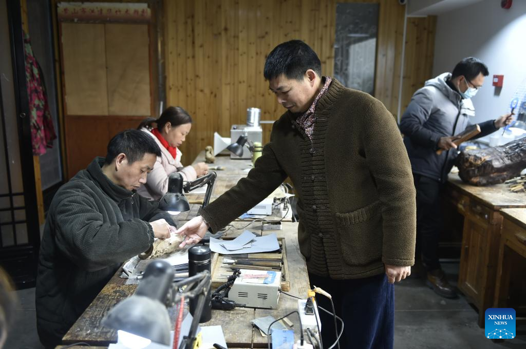 Hong Jianhua (2nd, R) guides a craftsman to carve bamboo art work at Huizhou Sculpture Museum in Huizhou District of Huangshan City, east China's Anhui Province, Jan. 7, 2025. Hong Jianhua, an inheritor of Huizhou bamboo carving listed in China's national intangible cultural heritages, has been dedicated to the craft since the age of 16. The art has received a new lease on life thanks to the efforts made by Hong to innovate technical methods, especially in high relief. To better pass on the craft, Hong launched a studio and a museum to make the beauty of this ancient Chinese art widely known among the public.