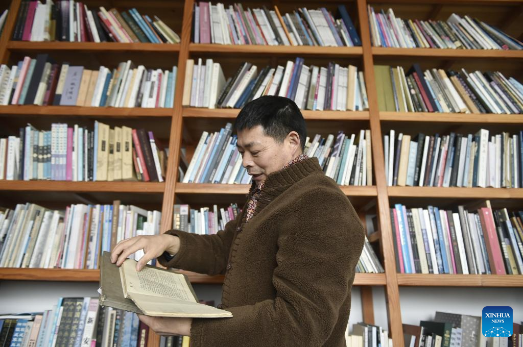 Hong Jianhua reads books on bamboo carvings at Huizhou Sculpture Museum in Huizhou District of Huangshan City, east China's Anhui Province, Jan. 7, 2025. Hong Jianhua, an inheritor of Huizhou bamboo carving listed in China's national intangible cultural heritages, has been dedicated to the craft since the age of 16. The art has received a new lease on life thanks to the efforts made by Hong to innovate technical methods, especially in high relief. To better pass on the craft, Hong launched a studio and a museum to make the beauty of this ancient Chinese art widely known among the public.