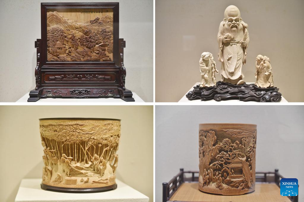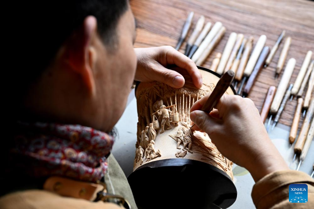The skills of bamboo carving, brick carving, wood carving and stone carving are the top four traditional carving arts in Huizhou. Taking the phyllostachys edulis, which is abundant in Huizhou area, as the raw material, bamboo carvers use knives to carve historical allusions, landscapes and other patterns on the phyllostachys edulis. (Xinhua/Lu Peng)
