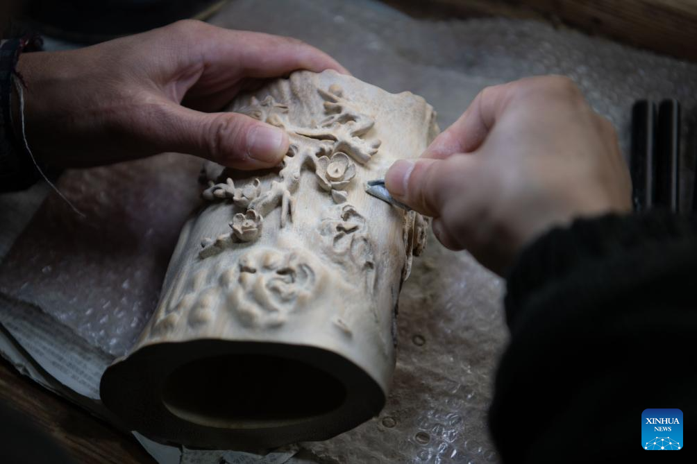 An apprentice of Hong Jianhua works on a bamboo carving at Huizhou Sculpture Museum in Huizhou District of Huangshan City, east China's Anhui Province, Jan. 7, 2025. Hong Jianhua, an inheritor of Huizhou bamboo carving listed in China's national intangible cultural heritages, has been dedicated to the craft since the age of 16. The art has received a new lease on life thanks to the efforts made by Hong to innovate technical methods, especially in high relief. To better pass on the craft, Hong launched a studio and a museum to make the beauty of this ancient Chinese art widely known among the public.