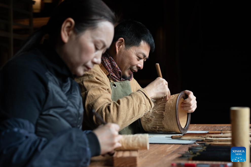 Hong Jianhua and his wife Zhang Hongyun work on bamboo carvings at Huizhou Sculpture Museum in Huizhou District of Huangshan City, east China's Anhui Province, Jan. 7, 2025. Hong Jianhua, an inheritor of Huizhou bamboo carving listed in China's national intangible cultural heritages, has been dedicated to the craft since the age of 16. The art has received a new lease on life thanks to the efforts made by Hong to innovate technical methods, especially in high relief. To better pass on the craft, Hong launched a studio and a museum to make the beauty of this ancient Chinese art widely known among the public.