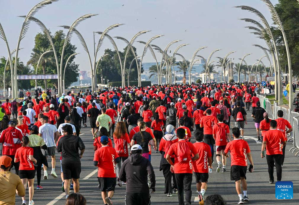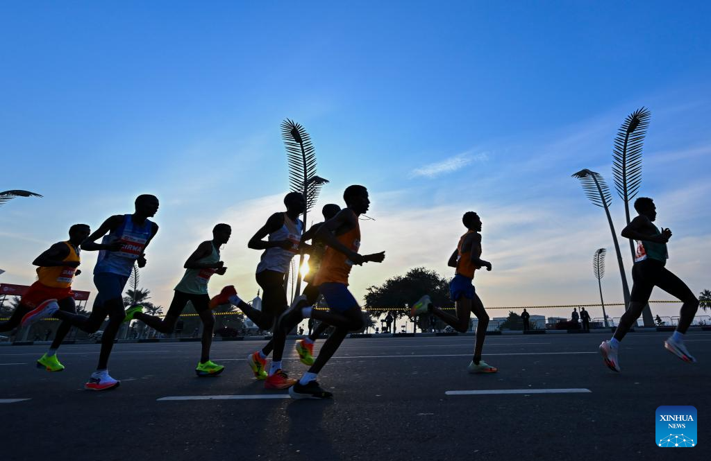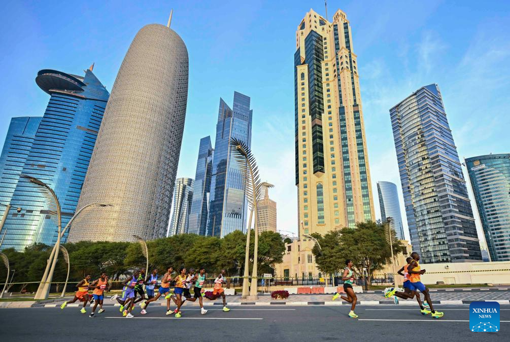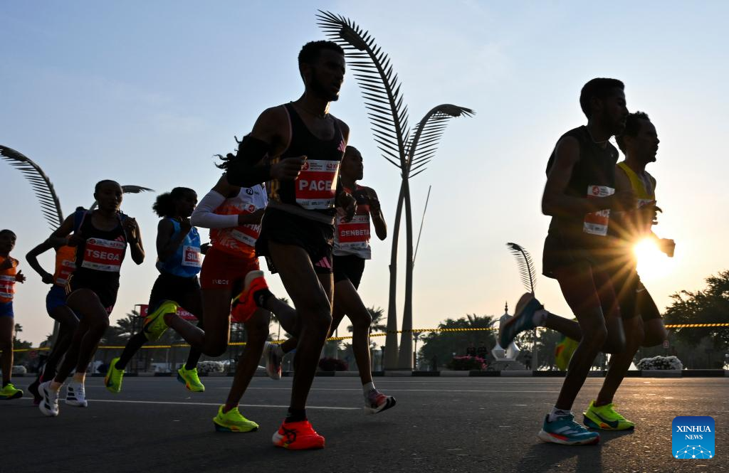 Participants run during the 2025 Doha Marathon in Doha, Qatar, Jan. 17, 2025. (Photo by Nikku/Xinhua)