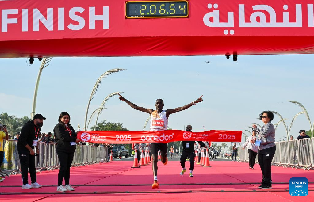 Ezra Kipketer Tanui of Kenya crosses the finish line during the 2025 Doha Marathon in Doha, Qatar, Jan. 17, 2025. (Photo by Nikku/Xinhua)