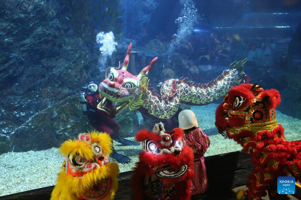Divers perform an underwater dragon dance at the SEA LIFE Bangkok Ocean World to welcome the upcoming Chinese New Year in Bangkok, Thailand, Jan. 16, 2025.