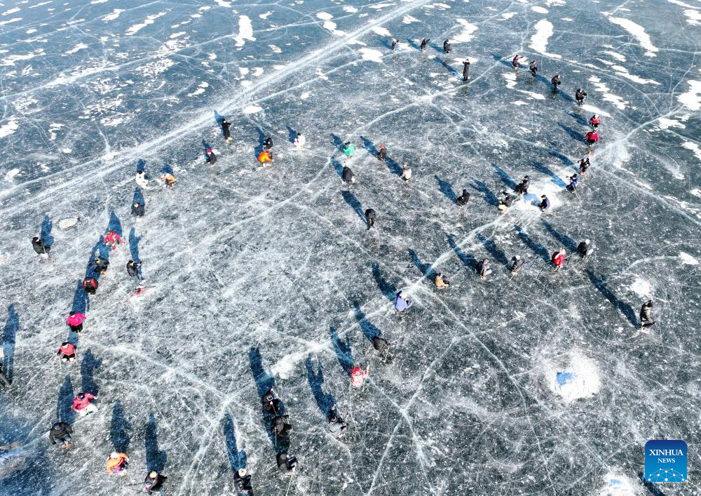 An aerial drone photo shows people riding single-blade sleds, a popular winter recreational activity among locals, on Taizi river in Liaoyang, northeast China's Liaoning Province, Jan. 15, 2025. (Xinhua/Li Gang)