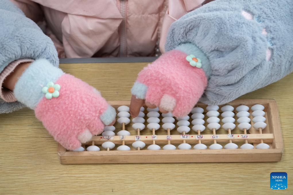A student practices abacus calculation at Dawei Primary School in Tunxi District of Huangshan City, east China's Anhui Province, Jan. 9, 2025. (Xinhua/Zhang Duan)