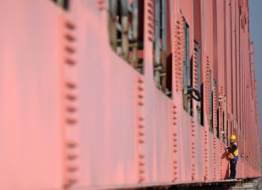 The bridge, with a total of 226 piers and nearly 100,000 bolts and fasteners, will be inspected by the workers twice to ensure the safe and smooth passage of trains during the 40-day Spring Festival travel rush. (Xinhua/Li Jianan)