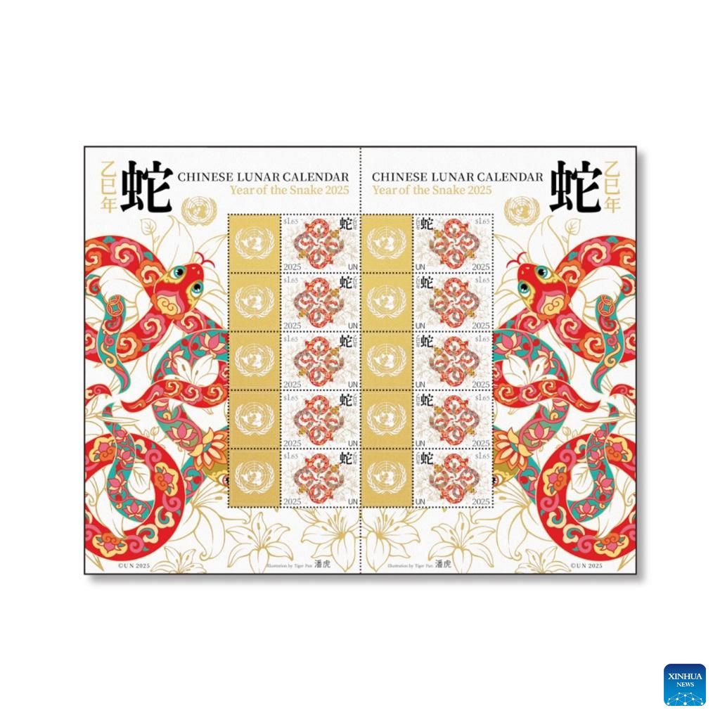 The image provided by the United Nations Postal Administration (UNPA) shows a Year of the Snake stamp sheet issued on Jan. 17, 2025. The UNPA on Friday issued a special-event stamp sheet to celebrate the upcoming Chinese Lunar New Year, the Year of the Snake. (UNPA/Handout via Xinhua)