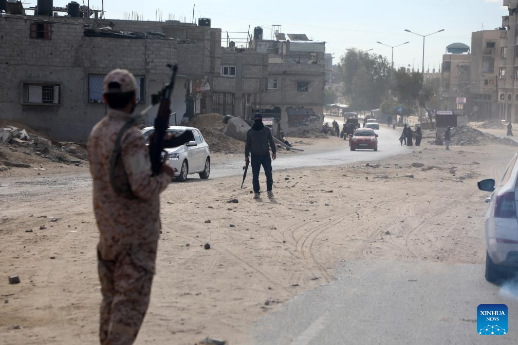 Members of the Palestinian Hamas police stand guard on a street in the southern Gaza Strip city of Khan Younis, on Jan. 20, 2025. Gaza's Hamas-run interior ministry said Saturday in a statement that its security forces will begin deploying across the Gaza Strip as soon as the ceasefire-for-hostage release deal takes effect on Sunday. (Photo by Rizek Abdeljawad/Xinhua)