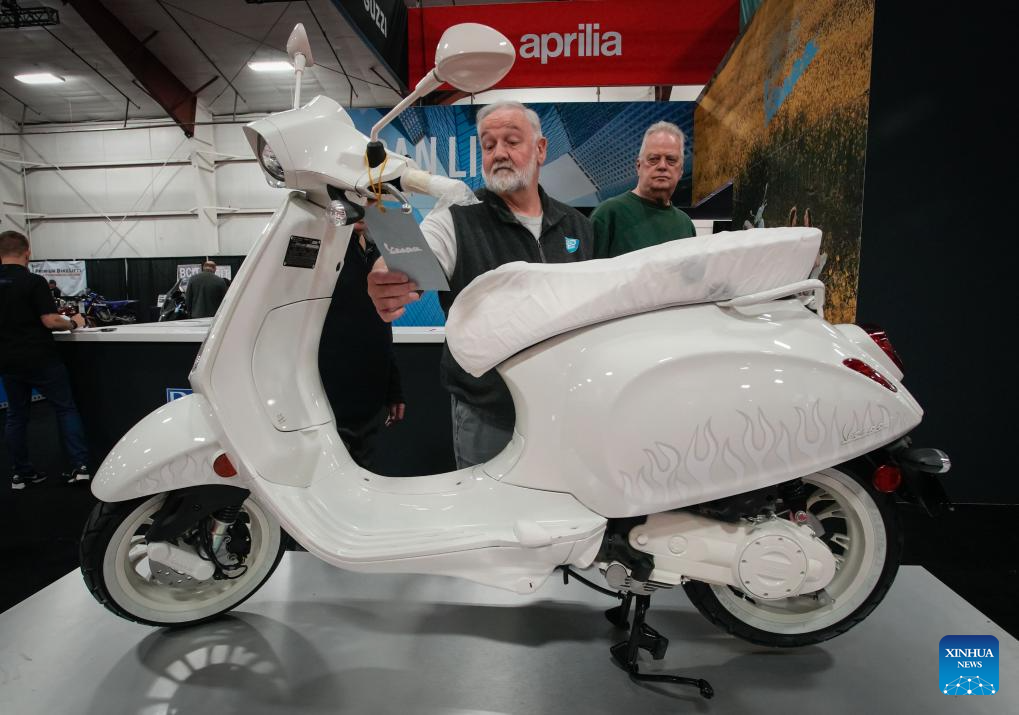 People view a motorcycle during the Vancouver Motorcycle and Powersport Show in Abbotsford, British Columbia, Canada, Jan. 17, 2025.