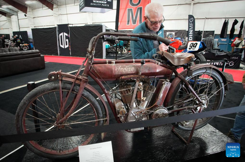 A man views a vintage motorcycle during the Vancouver Motorcycle and Powersport Show in Abbotsford, British Columbia, Canada, Jan. 17, 2025.