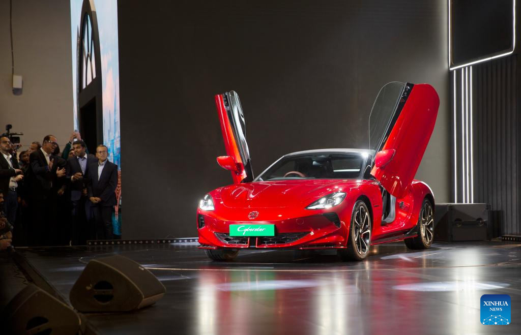 An MG Cyberster is presented during the Auto Expo 2025 in New Delhi, India, on Jan. 17, 2025. (Xinhua/Javed Dar)