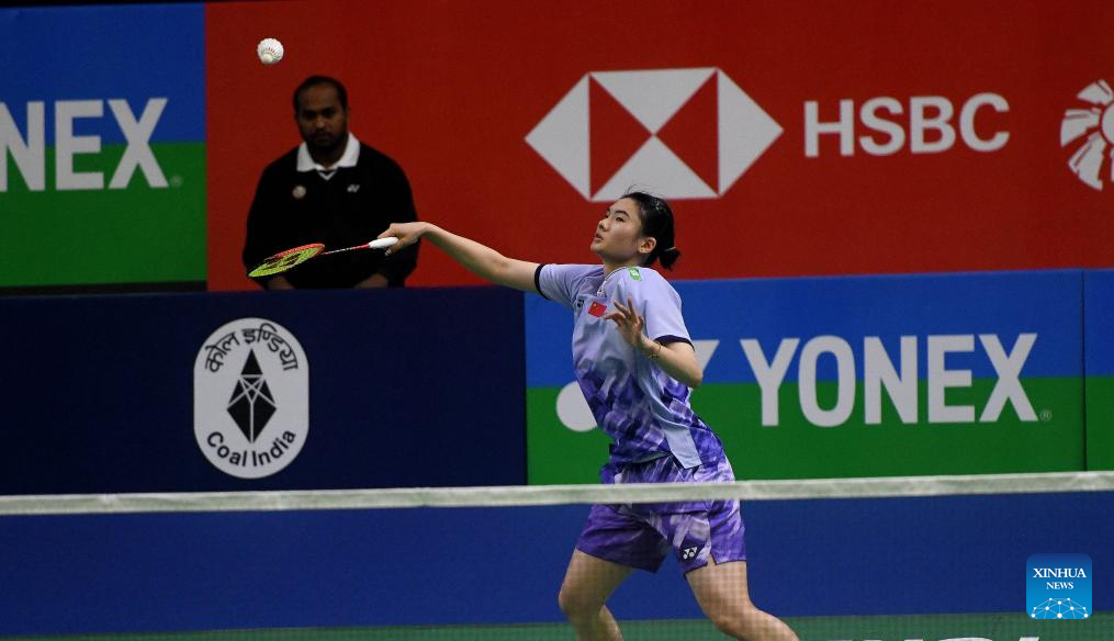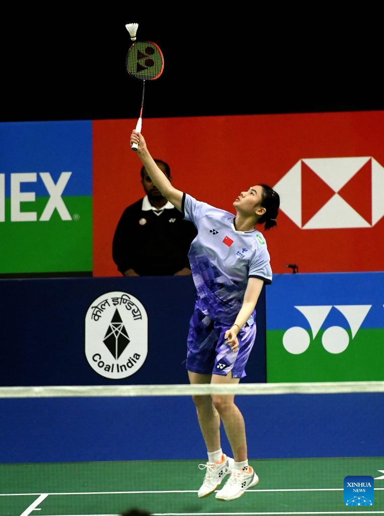 Han Yue of China hits a return during the women's singles quarterfinal match against Pornpawee Chochuwong of Thailand at the India Open 2025 badminton tournament in New Delhi, India, on Jan. 17, 2025. (Str/Xinhua)