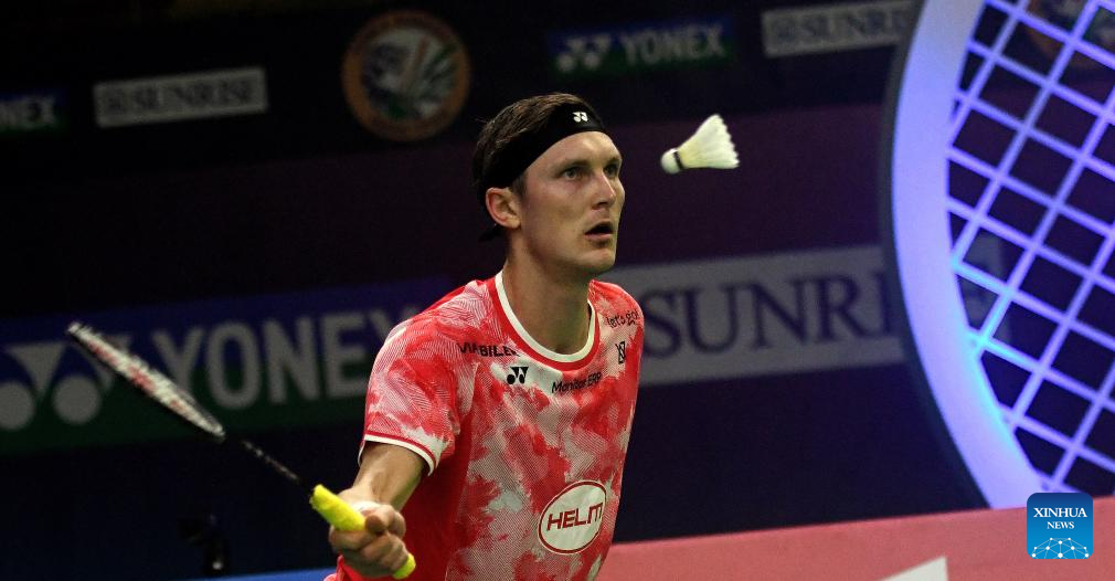Viktor Axelsen of Denmark hits a return during the men's singles quarterfinal match against Loh Kean Yew of Singapore at the India Open 2025 badminton tournament in New Delhi, India, on Jan. 17, 2025. (Str/Xinhua)