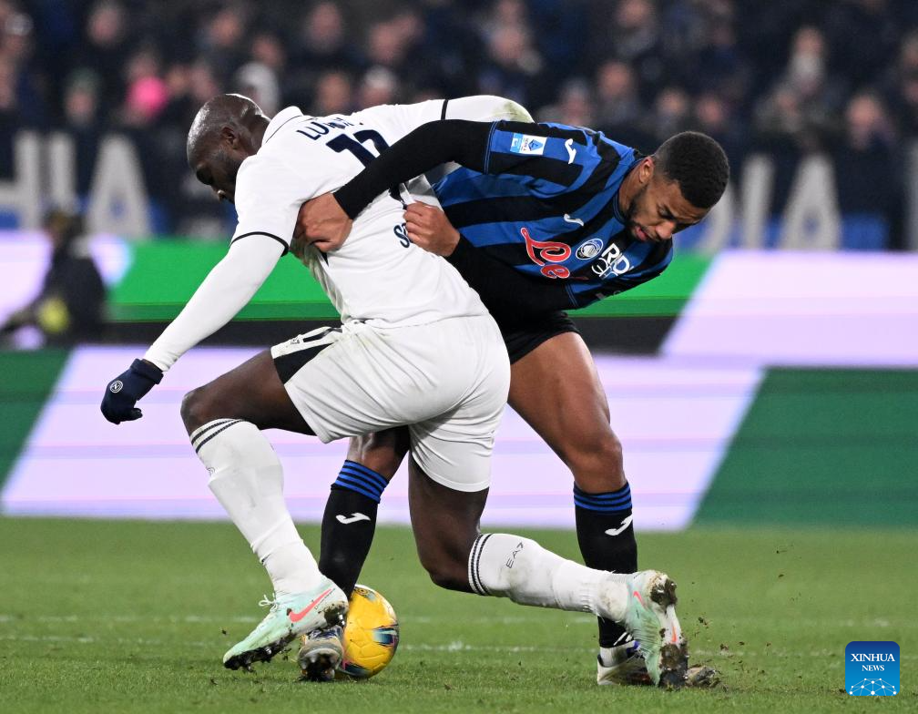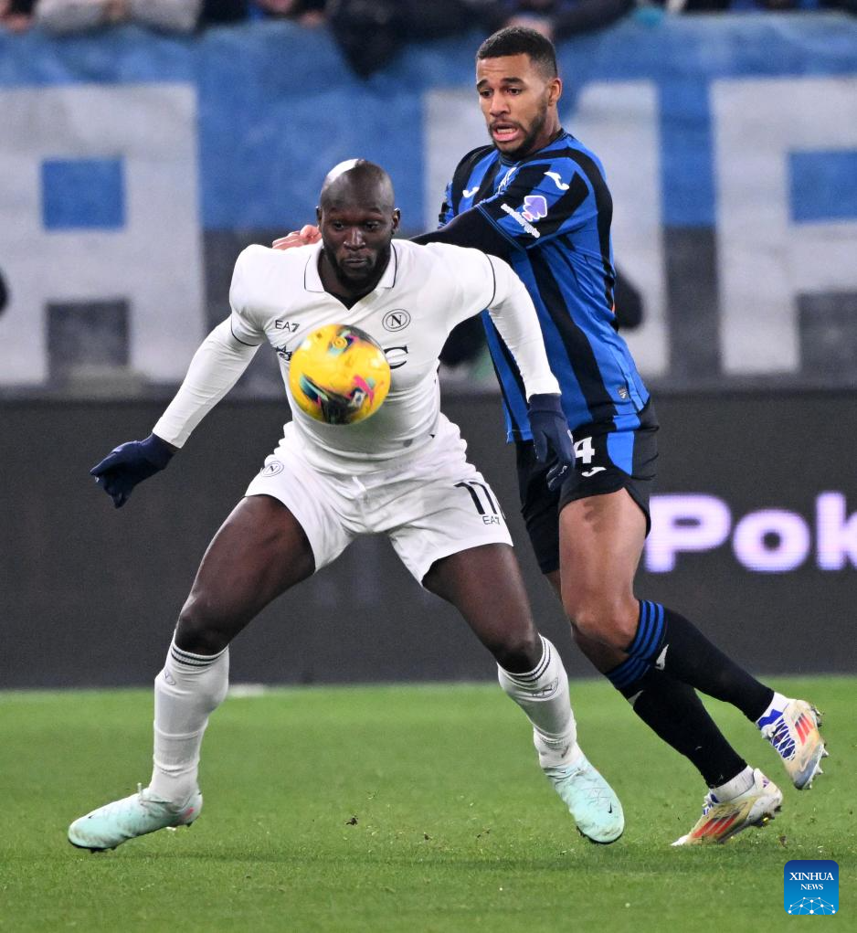 Napoli's Romelu Lukaku (L) vies with Atalanta's Isak Hien during a Serie A football match between Atalanta and Napoli in Bergamo, Italy, Jan. 18, 2025. (Photo by Alberto Lingria/Xinhua)