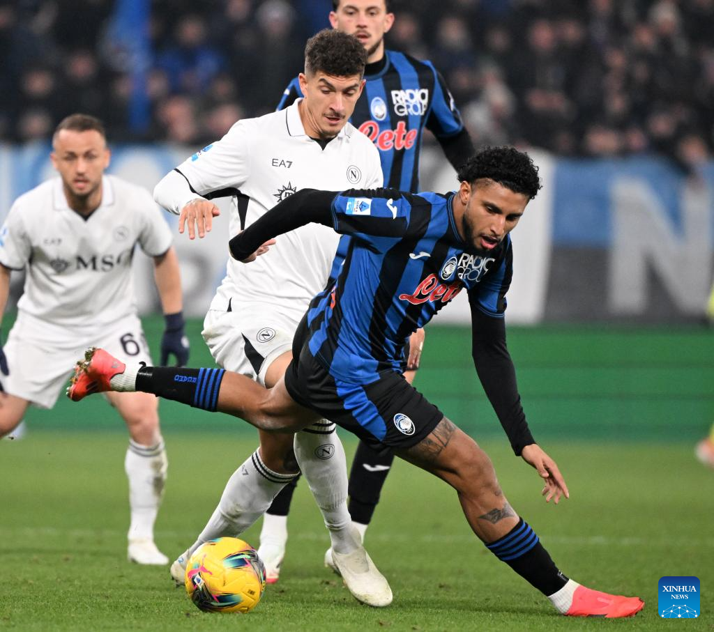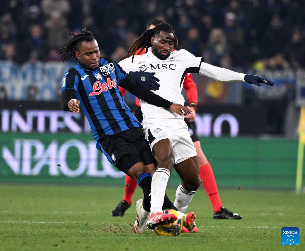 Napoli's Frank Anguissa (R) vies with Atalanta's Ademola Lookman during a Serie A football match between Atalanta and Napoli in Bergamo, Italy, Jan. 18, 2025. (Photo by Alberto Lingria/Xinhua)
