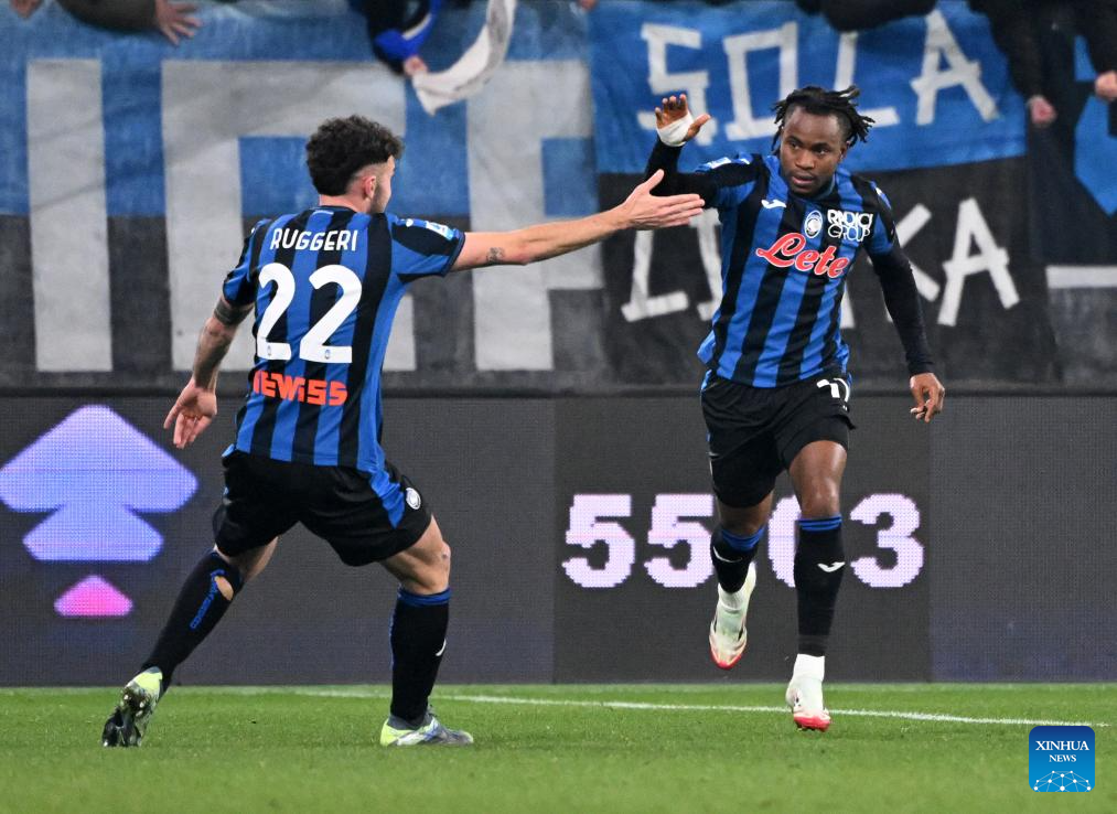 Atalanta's Ademola Lookman (R) celebrates his goal with his teammate Matteo Ruggeri during a Serie A football match between Atalanta and Napoli in Bergamo, Italy, Jan. 18, 2025. (Photo by Alberto Lingria/Xinhua)
