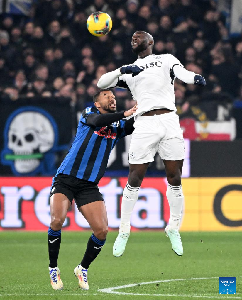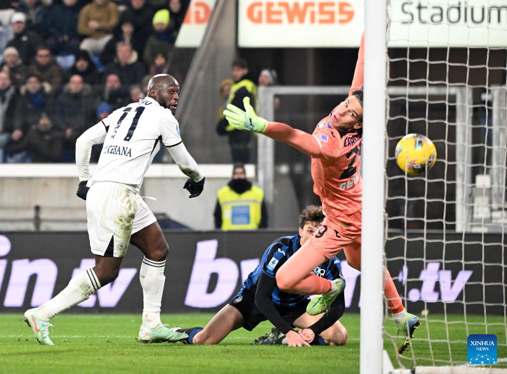 Napoli's Romelu Lukaku (L) scores during a Serie A football match between Atalanta and Napoli in Bergamo, Italy, Jan. 18, 2025. (Photo by Alberto Lingria/Xinhua)