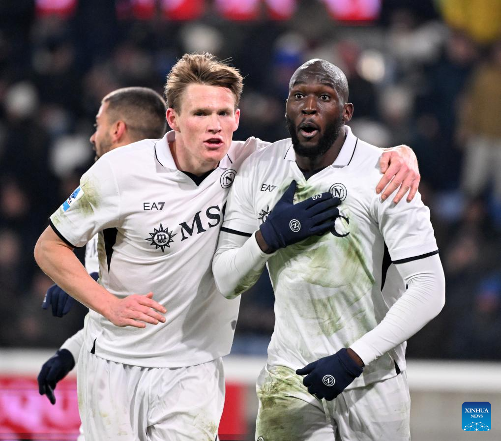 Napoli's Romelu Lukaku (R) celebrates his goal with his teammate Scott McTominay during a Serie A football match between Atalanta and Napoli in Bergamo, Italy, Jan. 18, 2025. (Photo by Alberto Lingria/Xinhua)