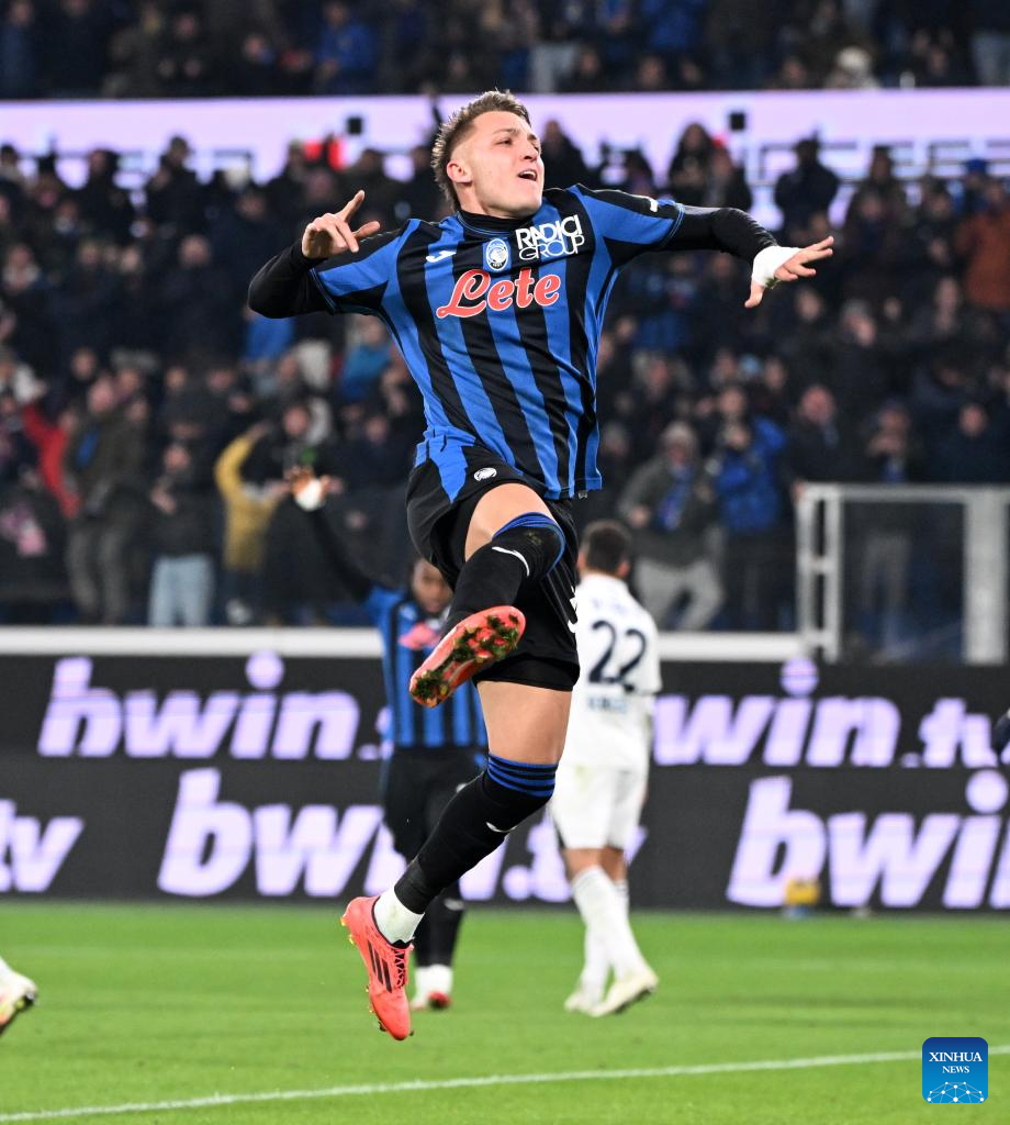 Atalanta's Mateo Retegui celebrates his goal during a Serie A football match between Atalanta and Napoli in Bergamo, Italy, Jan. 18, 2025. (Photo by Alberto Lingria/Xinhua)
