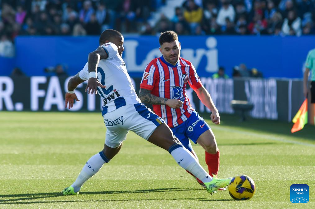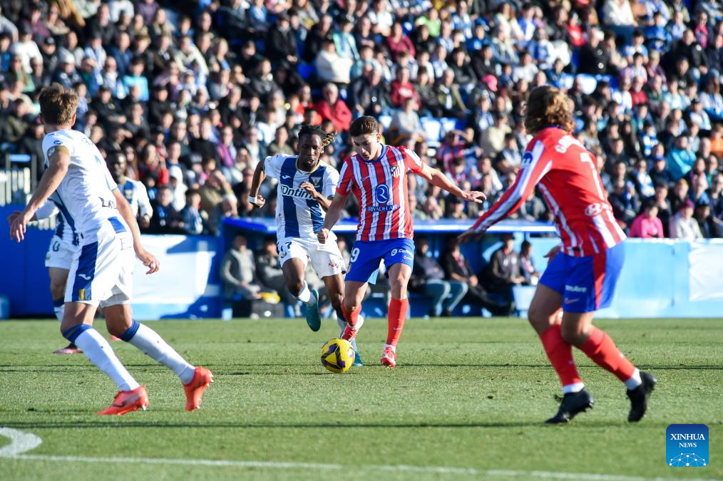 Julian Alvarez (2nd R) of Atletico de Madrid vies with Yvan Neyou (2nd L) of CD Leganes during the LaLiga football match between Atletico de Madrid and CD Leganes, in Municipal Butarque stadium, Madrid, Spain, on Jan. 18, 2025. (Photo by Gustavo Valiente/Xinhua)