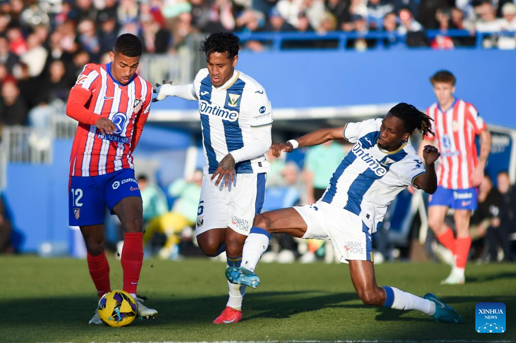 Samuel Lino (L) of Atletico de Madrid vies with Renato Tapia (C) and Yvan Neyou of CD Leganes during the LaLiga football match between Atletico de Madrid and CD Leganes, in Municipal Butarque stadium, Madrid, Spain, on Jan. 18, 2025. (Photo by Gustavo Valiente/Xinhua)