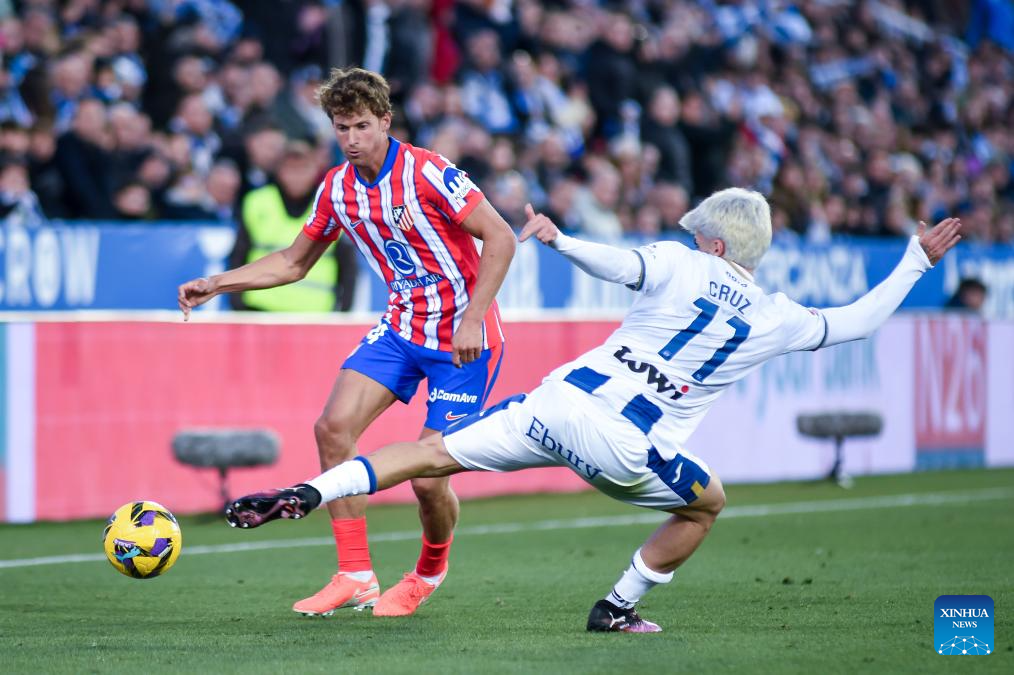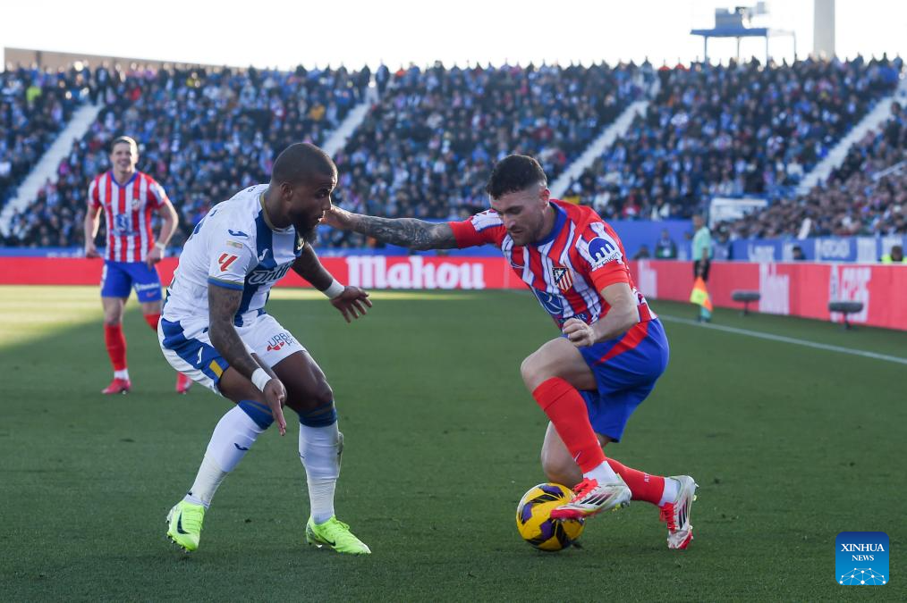Marcos Llorente (L) of Atletico de Madrid vies with Juan Cruz of CD Leganes during the LaLiga football match between Atletico de Madrid and CD Leganes, in Municipal Butarque stadium, Madrid, Spain, on Jan. 18, 2025. (Photo by Gustavo Valiente/Xinhua)