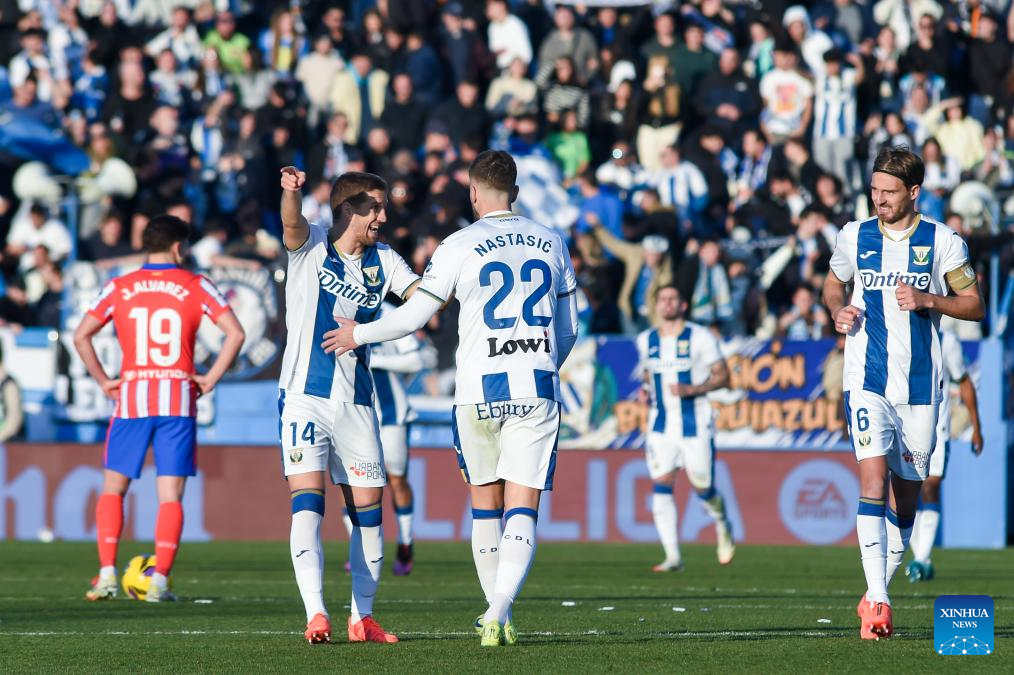 Players of CD Leganes celebrate a goal during the LaLiga football match between Atletico de Madrid and CD Leganes, in Municipal Butarque stadium, Madrid, Spain, on Jan. 18, 2025. (Photo by Gustavo Valiente/Xinhua)