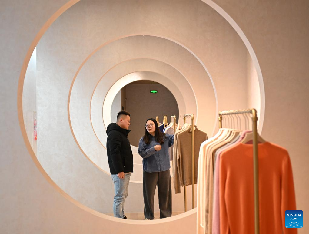 A staff member introduces cashmere sweaters to a customer at the exhibition hall of a cashmere products manufacturer in Qinghe County, Xingtai City, north China's Hebei Province, Jan. 18, 2025. Cashmere products manufacturers in Qinghe County are busy with production for orders before the upcoming Spring Festival holidays.
