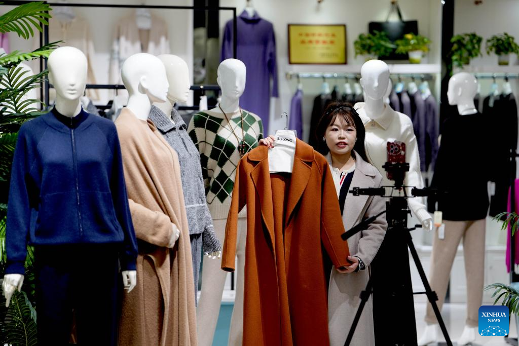 A staff member sells cashmere clothes via live-streaming at a store in Qinghe County, Xingtai City, north China's Hebei Province, Jan. 18, 2025. Cashmere products manufacturers in Qinghe County are busy with production for orders before the upcoming Spring Festival holidays.