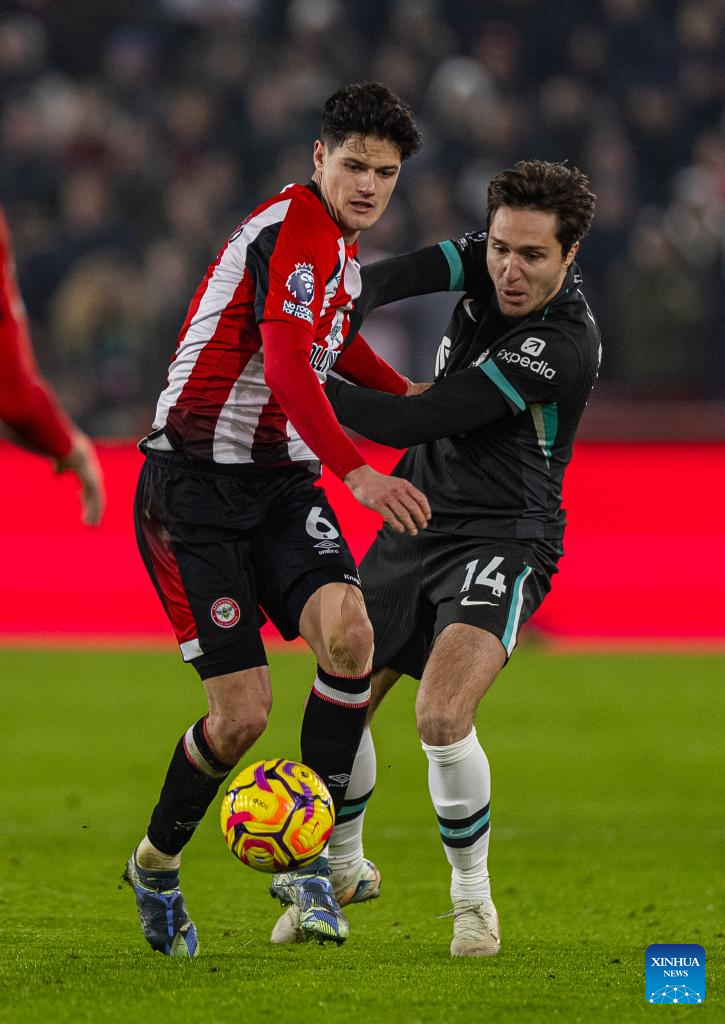 Liverpool's Federico Chiesa (R) is challenged by Brentford's Christian Norgaard during the English Premier League match between Brentford and Liverpool in London, Britain, on Jan. 18, 2025. (Xinhua)