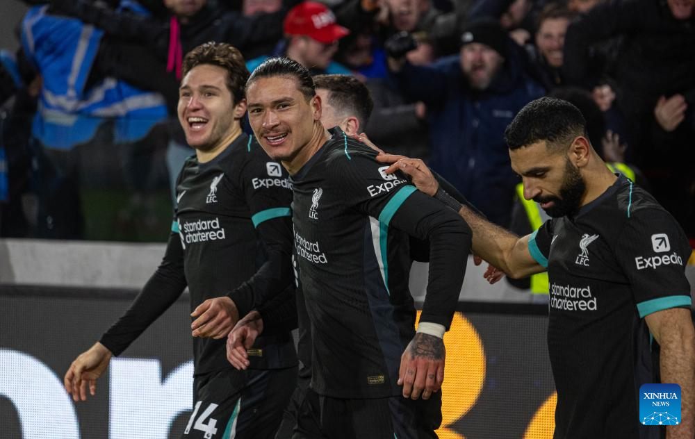 Liverpool's Darwin Nunez celebrates (front top) after scoring during the English Premier League match between Brentford and Liverpool in London, Britain, on Jan. 18, 2025. (Xinhua)