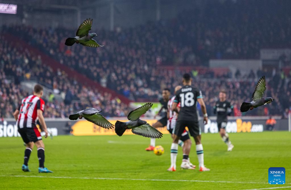 Birds fly from the pitch during the English Premier League match between Brentford and Liverpool in London, Britain, on Jan. 18, 2025. (Xinhua)