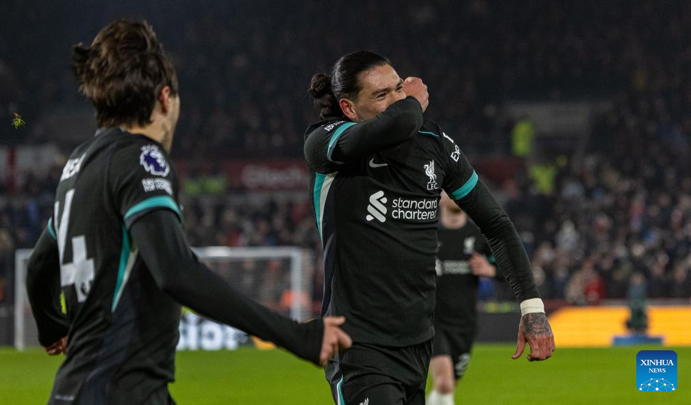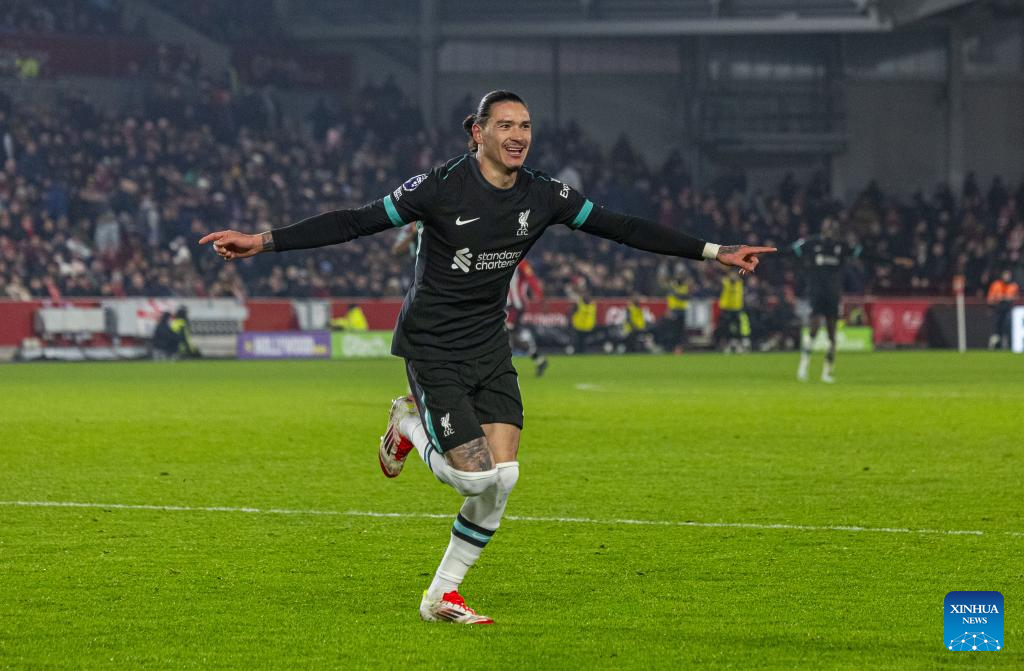 Liverpool's Darwin Nunez celebrates after scoring during the English Premier League match between Brentford and Liverpool in London, Britain, on Jan. 18, 2025. (Xinhua)