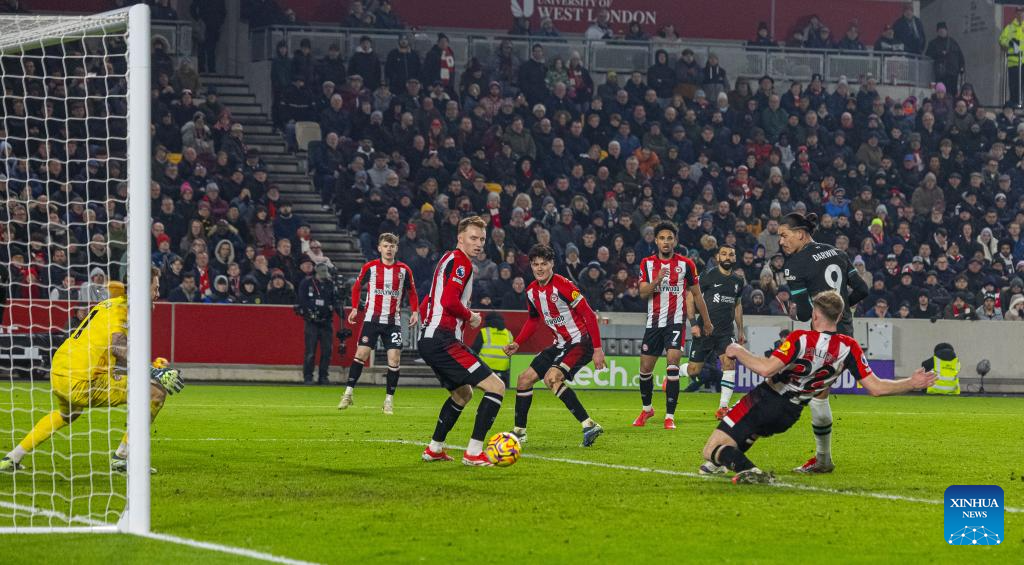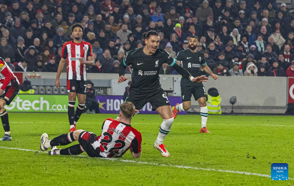 Liverpool's Darwin Nunez scores the first goal during the English Premier League match between Brentford and Liverpool in London, Britain, on Jan. 18, 2025. (Xinhua)