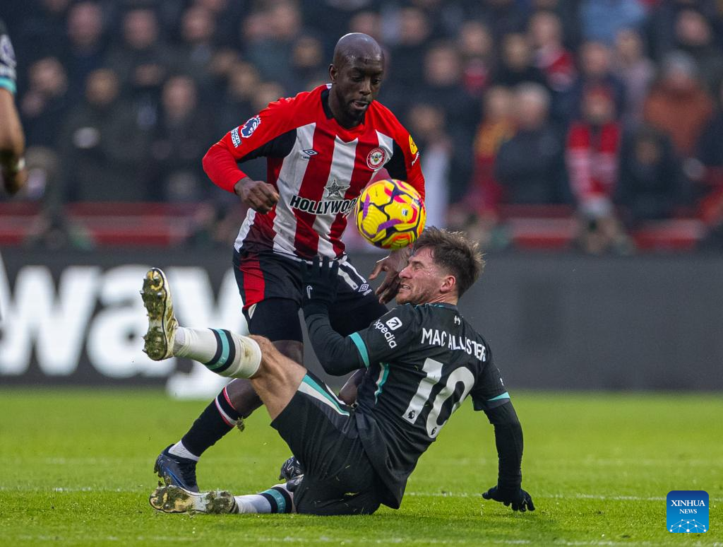Liverpool's Alexis Mac Allister (R) is challenged by Brentford's Yoane Wissa during the English Premier League match between Brentford and Liverpool in London, Britain, on Jan. 18, 2025. (Xinhua)