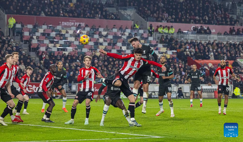 Liverpool's Alexis Mac Allister (top) sees his header go wide during the English Premier League match between Brentford and Liverpool in London, Britain, on Jan. 18, 2025. (Xinhua)